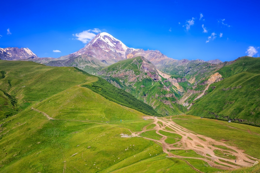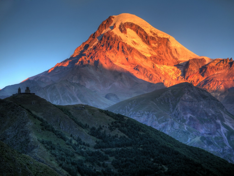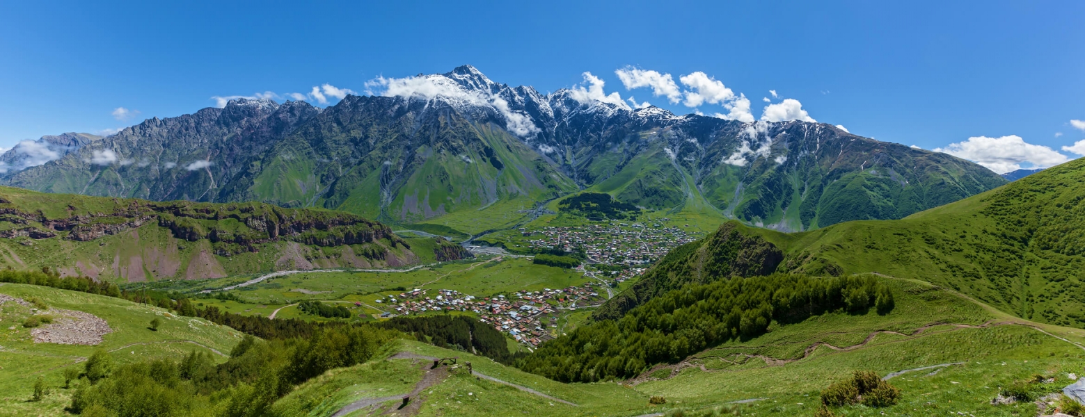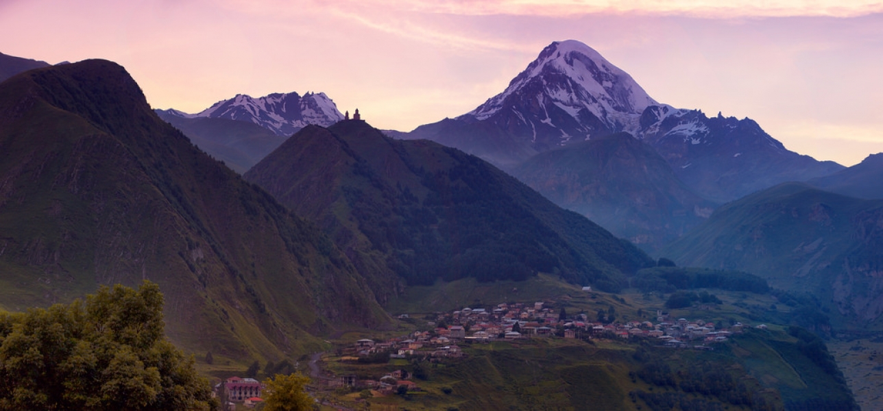 Travel on the Georgian Military road to the the small town Stepantsminda (formerly Kazbegi), located in the Greater Caucasus mountains, at an elevation of 1,740 meters (5,710 feet) above sea level. Local attractions include Kazbegi Ethnographic Museum in town, and the Gergeti Trinity Church outside of town, as well as Mount Kazbegi and the alpine meadows and forests of the surrounding Kazbegi Nature Reserve.