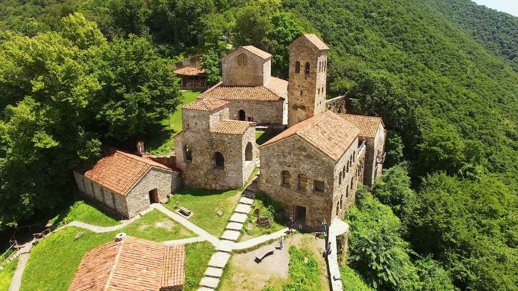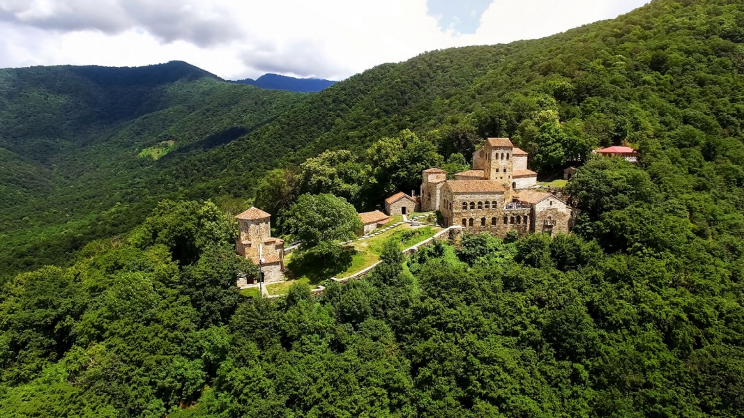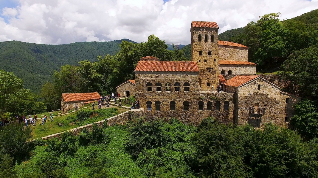The monastery itself is valid. Situated on top of a steep hill overlooking the Alazani valley, the complex contains various ecclesiastical buildings built at different times, including: the Blessed Virgin Church (VI-VII century); a basilica-type church that dates to the IV century (one of the earliest surviving Christian churches); a two-storey bishop’s palace (IX century); a four-storey tower (XVI century); and a wine cellar (marani).